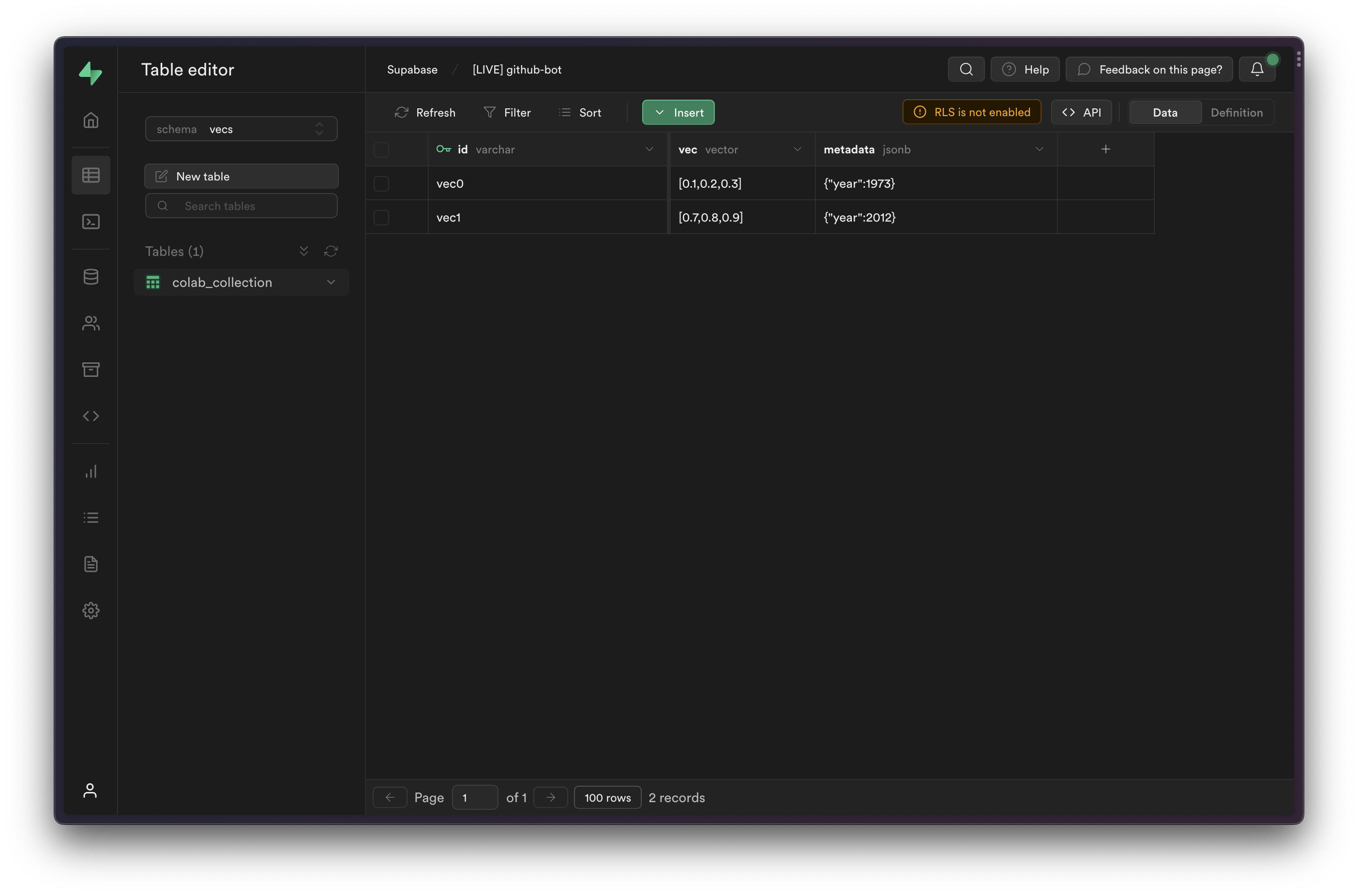 1collection = vx.get_or_create_collection(name="colab_collection", dimension=3)23collection.upsert(4 vectors=[5 (6 "vec0", # the vector's identifier7 [0.1, 0.2, 0.3], # the vector. list or np.array8 {"year": 1973} # associated metadata9 ),10 (11 "vec1",12 [0.7, 0.8, 0.9],13 {"year": 2012}14 )15 ]16)This will create a table inside your database within the vecs schema, called colab_collection. You can view the inserted items in the Table Editor, by selecting the vecs schema from the schema dropdown.