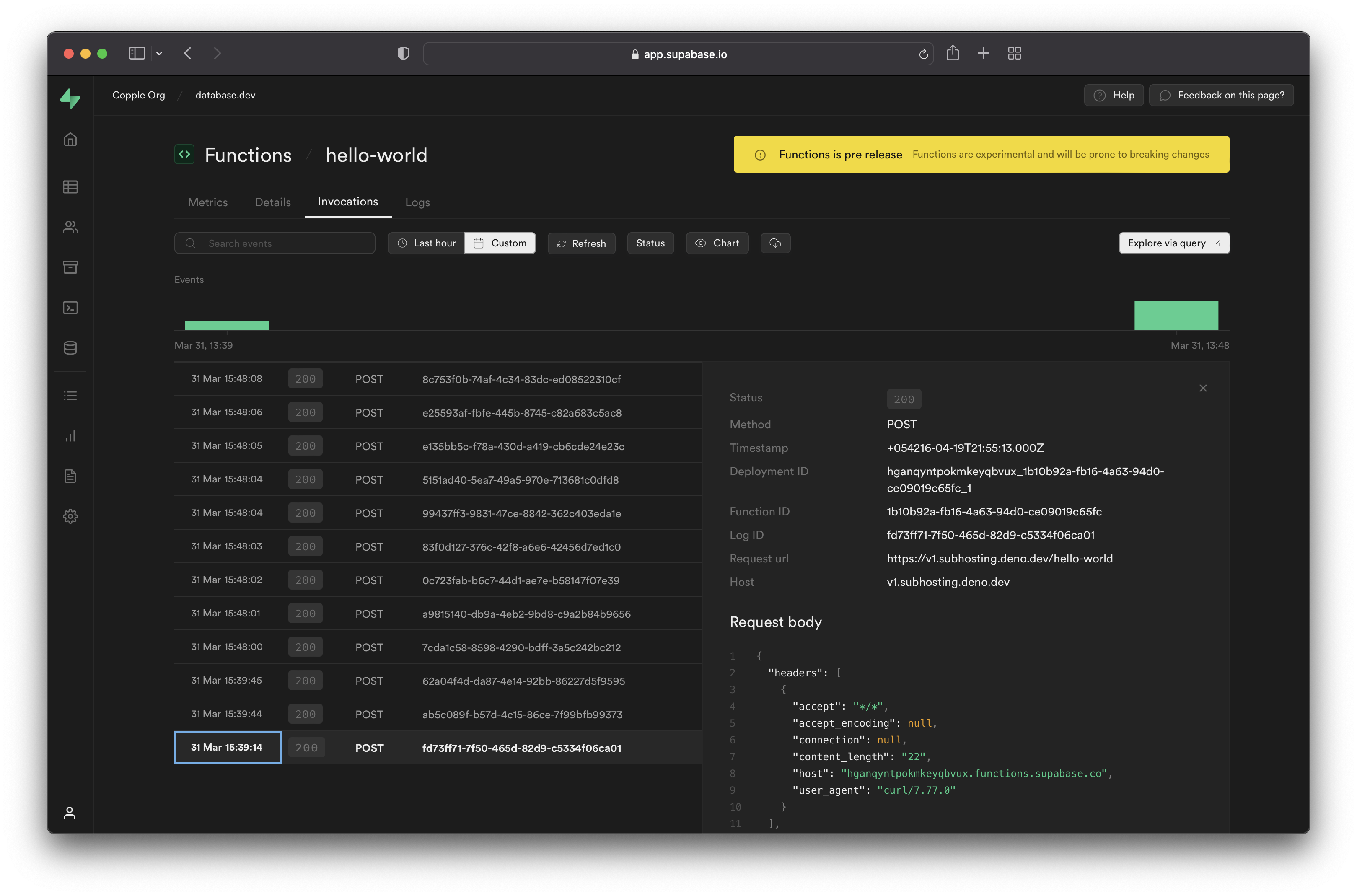 1import { FunctionsHttpError, FunctionsRelayError, FunctionsFetchError } from '@supabase/supabase-js'23const { data, error } = await supabase.functions.invoke('hello', {4 headers: { 'my-custom-header': 'my-custom-header-value' },5 body: { foo: 'bar' },6})78if (error instanceof FunctionsHttpError) {9 const errorMessage = await error.context.json()10 console.log('Function returned an error', errorMessage)11} else if (error instanceof FunctionsRelayError) {12 console.log('Relay error:', error.message)13} else if (error instanceof FunctionsFetchError) {14 console.log('Fetch error:', error.message)15}Make sure to handle the errors properly. Functions that fail silently are hard to debug, functions with clear error messages get fixed fast.