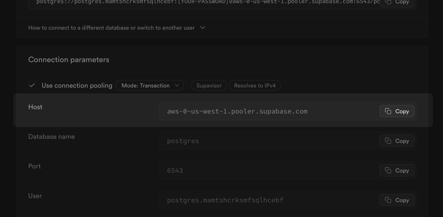 - Under the Session pooler, click on the View parameters under the connect string. Note your Host (
